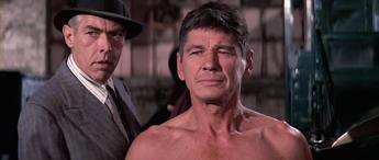 The sun is setting and Mr. Bronson’s Chaney goes poking around for something to and a buck to be made. Finding odd sounds from an open warehouse. Where, upon closer inspections men are gathered and bets are being waged and tallied on two well muscled specimens. Each with their own “promoter”. One is shabbily dress and hungry for a buck. While the other, “Speed” is Mr. Coburn in his natty, seersucker suited best.