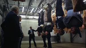 Sending his men out to fetch all the London organization’s family heads for some Q&A. Unique in that all the gang heads are brought to the massive freezer of one of Harold’s abattoirs. Bound hand and foot and suspended upside down from clean, unburied, stainless steel meat hooks.