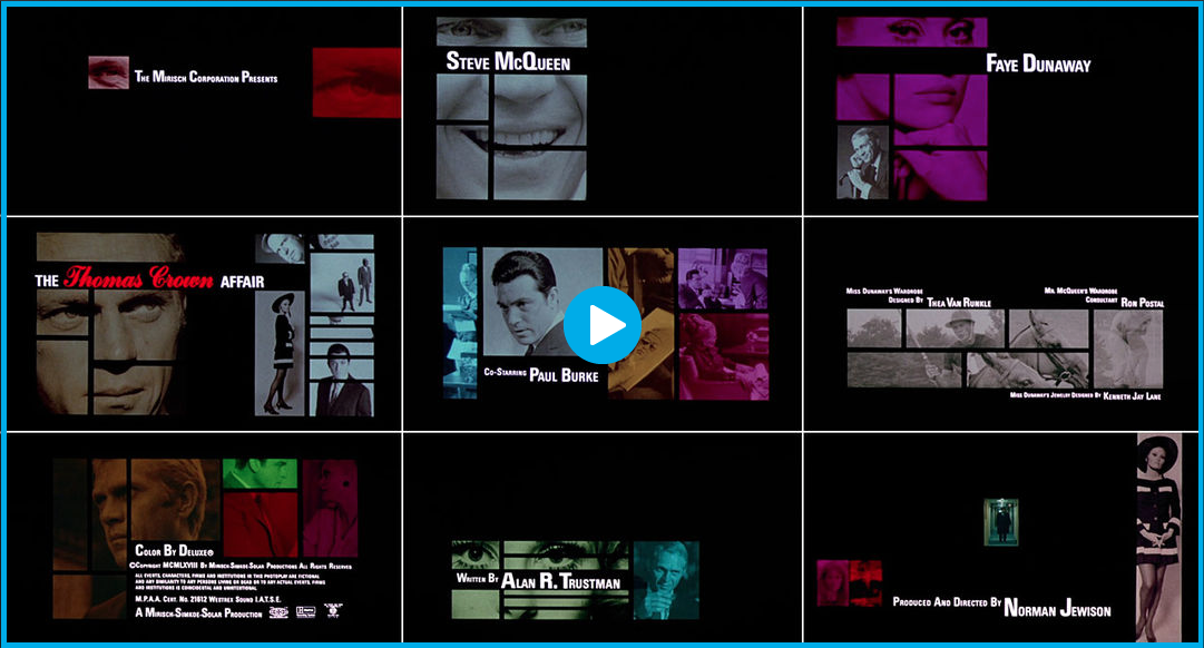 “Using the multi-screen technique for which he would become famous, Ferro’s opening titles for The Thomas Crown Affair introduce viewers to the many sides of this story. From Crown’s double life of luxury and larceny, to the men he secretly employs and the woman who pursues him (Faye Dunaway), the titles establish all the players in this high stakes game of cat and mouse. Composer Michel Legrand’s theme “The Windmills of Your Mind,” a gorgeous ballad sung by Noel Harrison (son of Rex), lends the opening an air of melancholy, glamourizing Crown’s life while hinting at his unhappiness. The sequence also prepares the audience for the film’s many split-screen sequences, which Ferro designed and edited as well.”